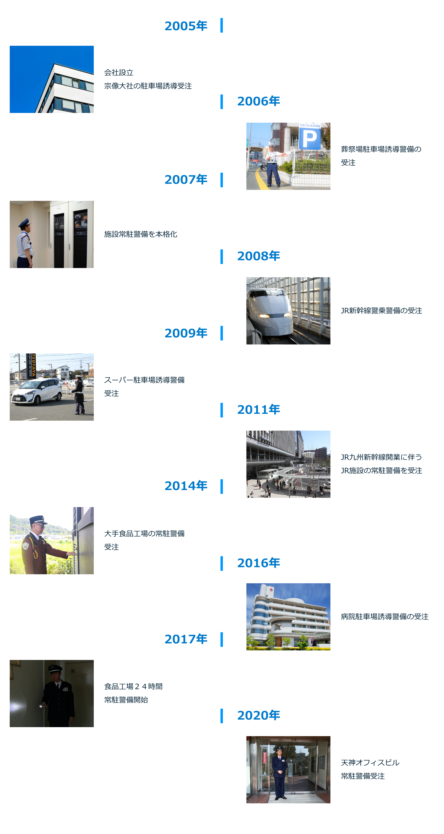 2005年福岡市東区に会社設立し、以来「ホスピタリティの精神」をモットーに、お客様の立場に立った謙虚な姿勢で警備業務を遂行しています。
