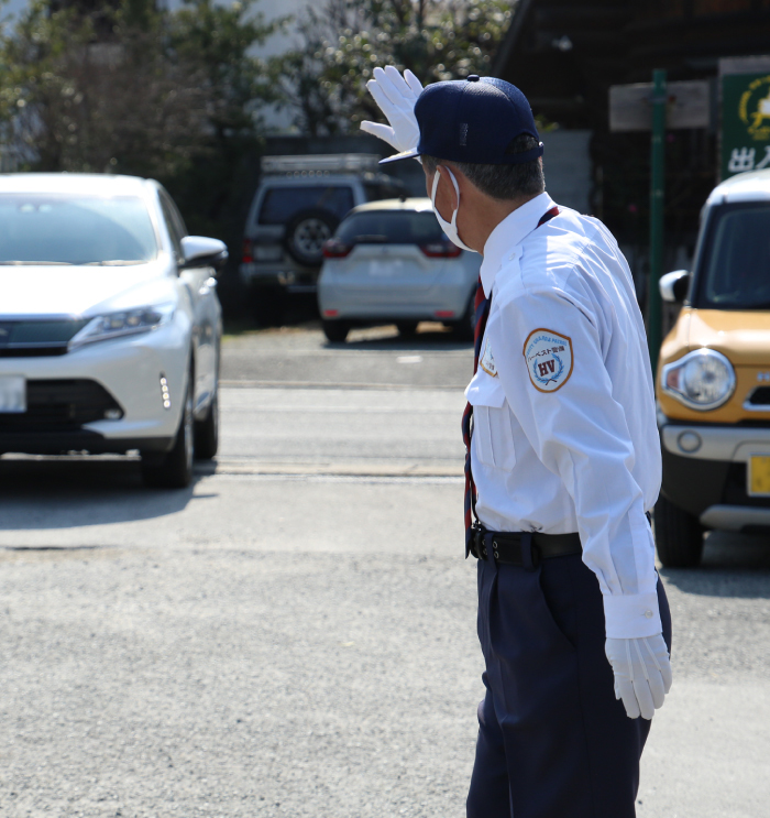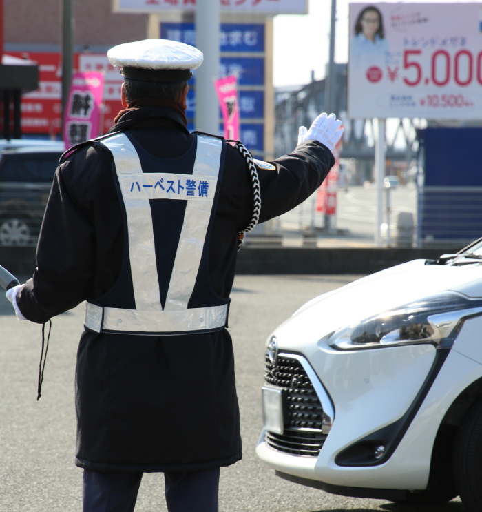 場内での徐行運転の呼びかけや出車時の道路状況や場内の状況確認を行い、万が一の事故が起こらないように細心の注意をはらい警備をいたします。